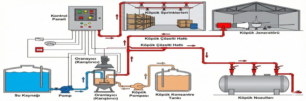 Manuel veya otomatik olarak devreye girebilen köpüklü söndürme sistemi, sprinkler sistemleri, yangın dolapları, köpük monitörleri, köpük jeneratörleri gibi farklı bileşenlerle entegre şekilde çalışabilir. Tarafımızdan tedarik edilen tüm ekipmanlar uluslararası standartlara uygun olup, montaj, projelendirme ve periyodik bakım hizmetleri profesyonel ekipler tarafından sağlanmaktadır. Sistemin tasarımında VdS – Almanya onaylı hidrolik hesap programları kullanılmakta ve projeye ait tüm teknik dökümanlar müşteriye eksiksiz olarak teslim edilmektedir.