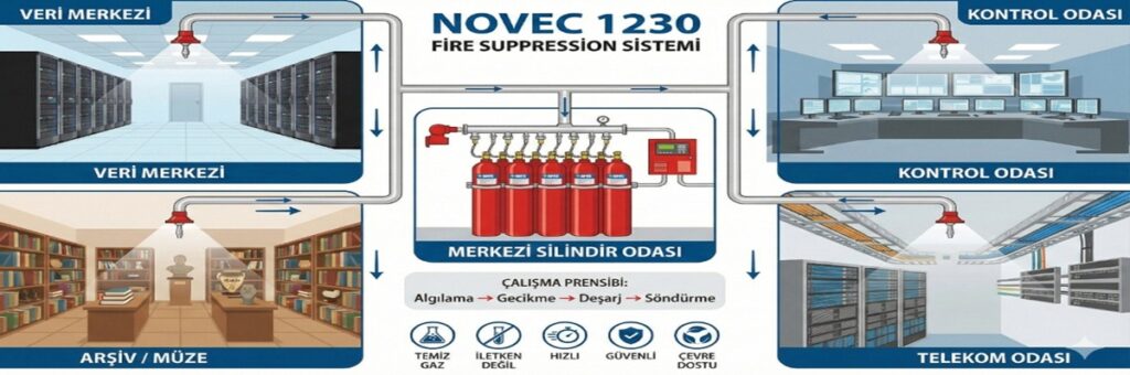 Novec 1230 gazlı söndürme sistemleri, çok geniş bir uygulama yelpazesinde kullanılmakta olup özellikle yüksek değerli ekipman, veri ve kritik altyapıların korunmasında tercih edilmektedir.